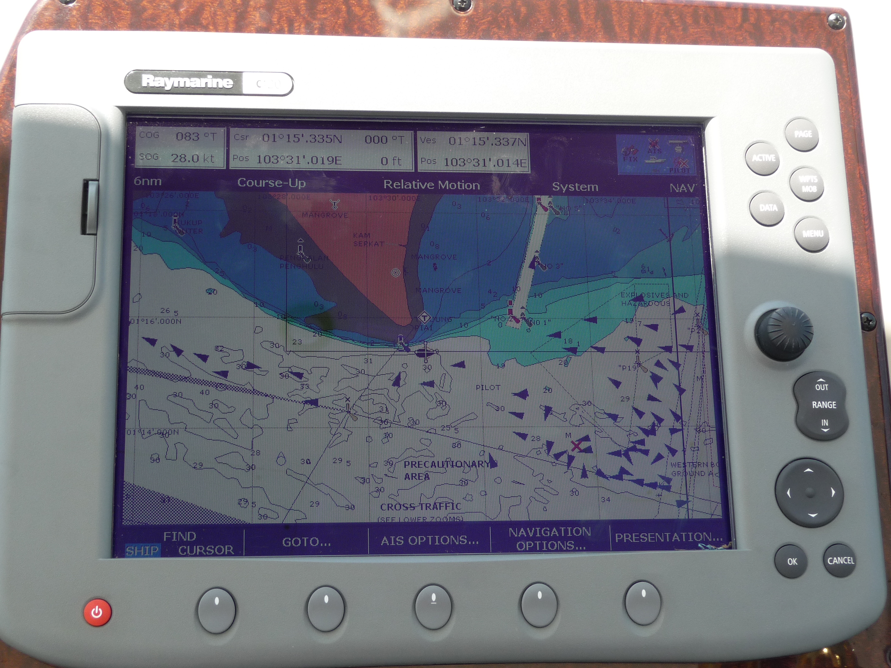 Every arrow head on the chart-plotter shown above is a huge cargo ship of every description imaginable, a container-ship or an oil- tanker either at anchor or in progress to and from Singapore, one of the world’s busiest maritime ports and this wall-to-wall traffic makes the voyage down the coast very interesting indeed. There are also many examples of “Tugs-in-Tow” hauling huge heavily-laden barges well over two hundred metres in length. Added to this is the constant vigilance required to spot the many very-active fishing boats and crews mostly employing very long nets stretching for hundreds of meters that have to be avoided, on the edge of the Traffic Separation Scheme (TSS) or shipping channels.