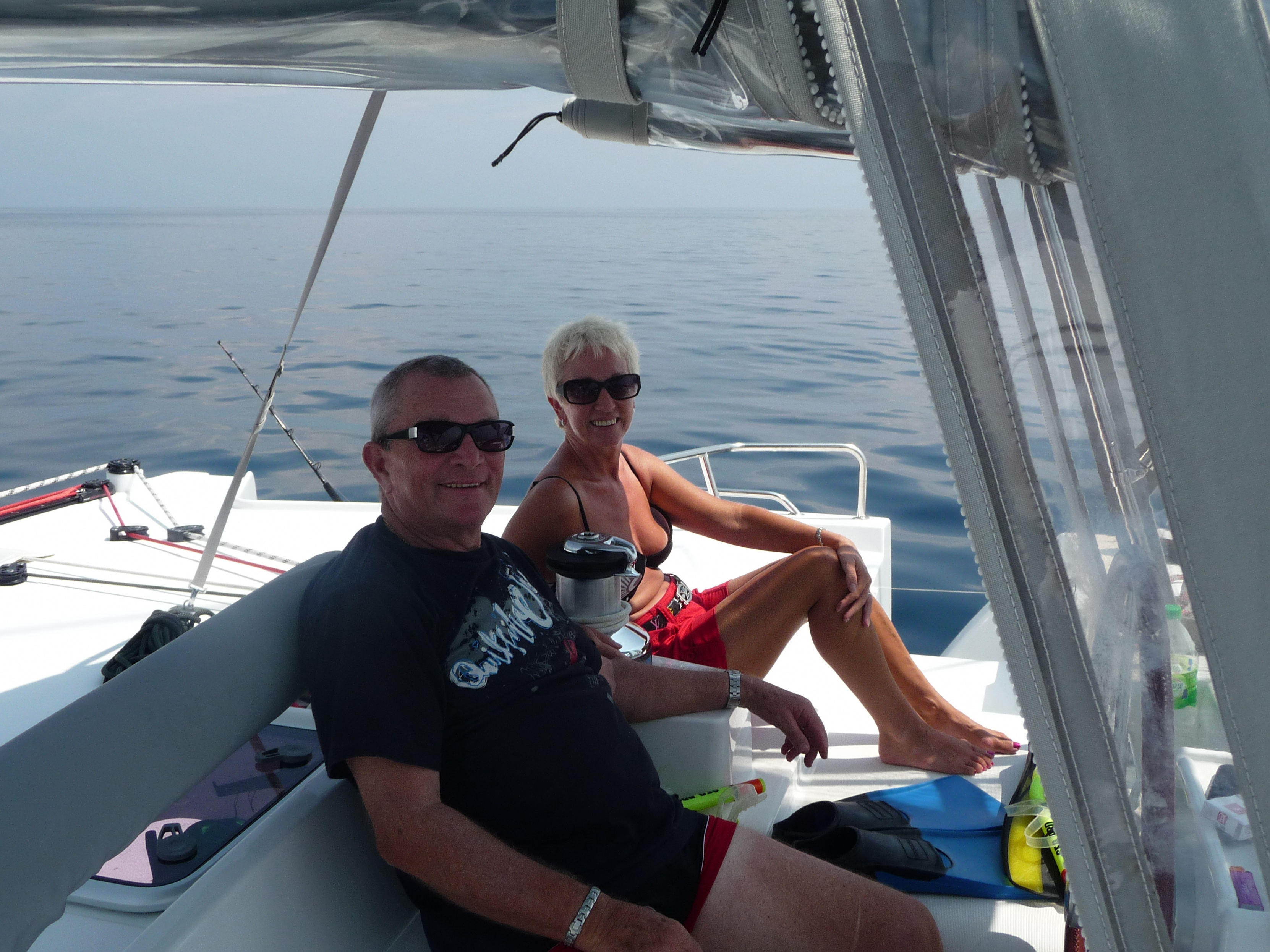 Catamarans are roomy, stable, have luxury queen-size cabins with en-suite bathroom facilities, come with large entertainment, lounging and sun-bathing areas, a modern kitchen packed with all mod-cons, air-conditioning, plenty of refrigeration, sound-surround TV and music systems. And that is just at first glance! Also they are equipped with all the latest electronic navigation wizardry to make passage-making and finding your dream destination quick, easy and very safe. All sheets are brought back to the helm and are controlled by four electronic sheet-winches making trimming the sails, raising, reefing, or dropping the large fully battened main-sail and furling or un-furling the beautiful head-sail, a one-man job. A modern electronic full-color chart-plotter, GPS, wind speed and direction gauges, auto-pilot, radar, engine RPM, temperature and oil pressure gauges and a large comfortable leather covered stainless steel wheel at the helm up on the fly bridge makes the Captain’s job a dream, even in inclement weather!